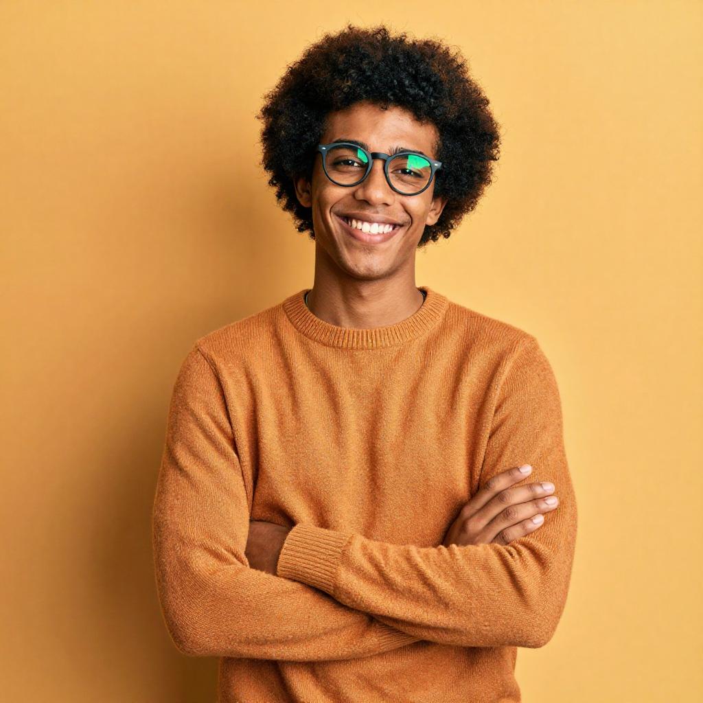Photograph of a young man with light brown skin and a medium build, standing against a solid orange background. He has a natural afro hairstyle, wears green-tinted glasses, and smiles broadly, showing his teeth. He's dressed in a cozy, long-sleeve, orange sweater, with his arms crossed over his chest. The lighting is even, highlighting his relaxed and happy demeanor.