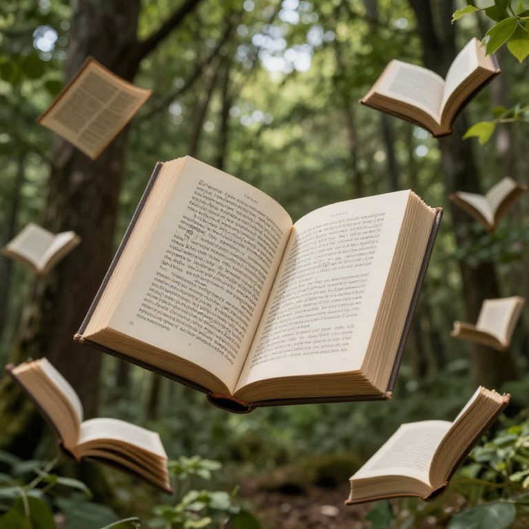 Photograph of open books floating mid-air in a sunlit, green forest with blurred trees and foliage in the background.