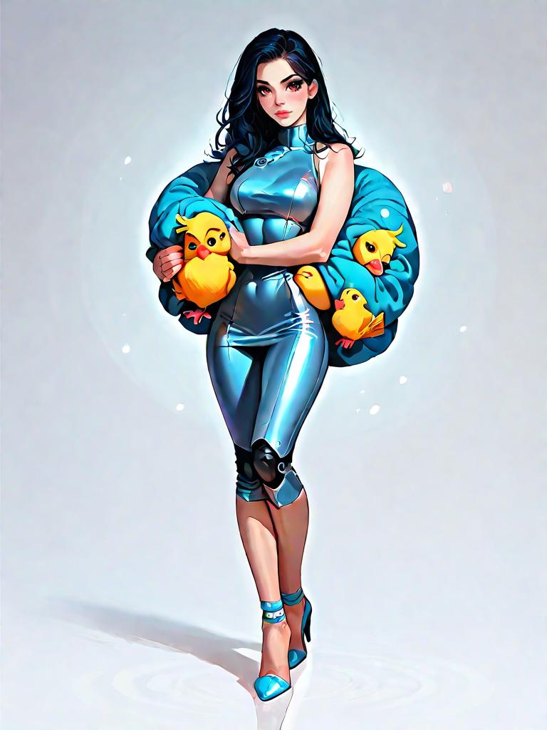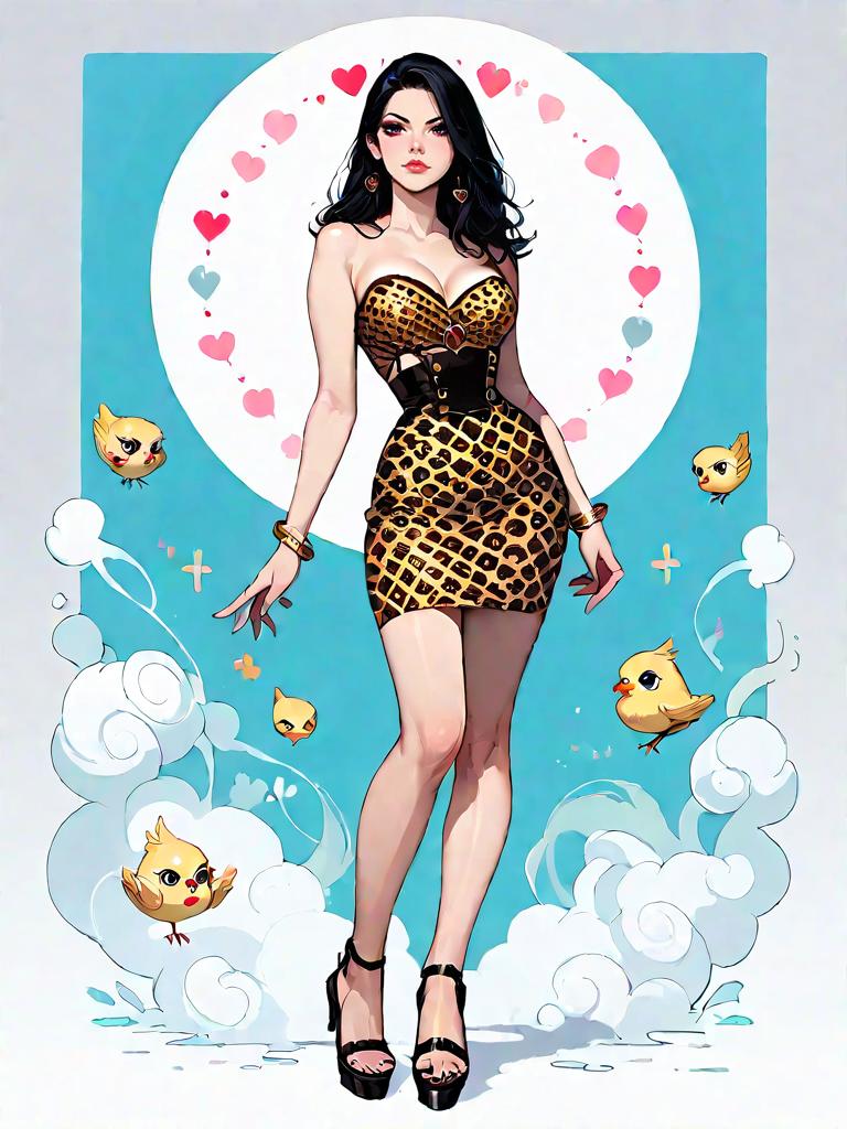 Full body digital illustration of a chic woman with long black hair wearing a strapless leopard print dress with a sweetheart neckline and fitted silhouette. She is accessorized with gold bangles and black high-heeled sandals. The background features a circular pattern of hearts and whimsical small yellow birds surrounded by stylized clouds.
