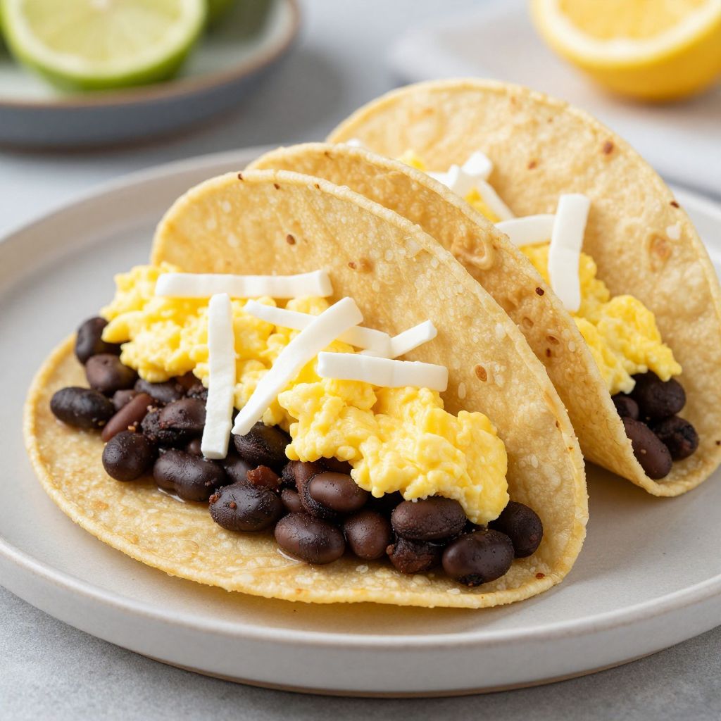 Typical breakfast ingredients get the dinner-time treatment in this taco recipe, which calls for corn tortillas, scrambled eggs, and black beans topped with crumbled queso fresco.