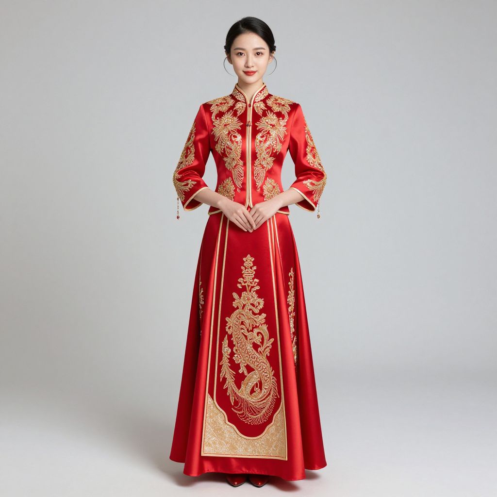 Photograph of an Asian woman with fair skin, black hair in a bun, wearing a vibrant red traditional Chinese gown adorned with intricate gold embroidery, standing