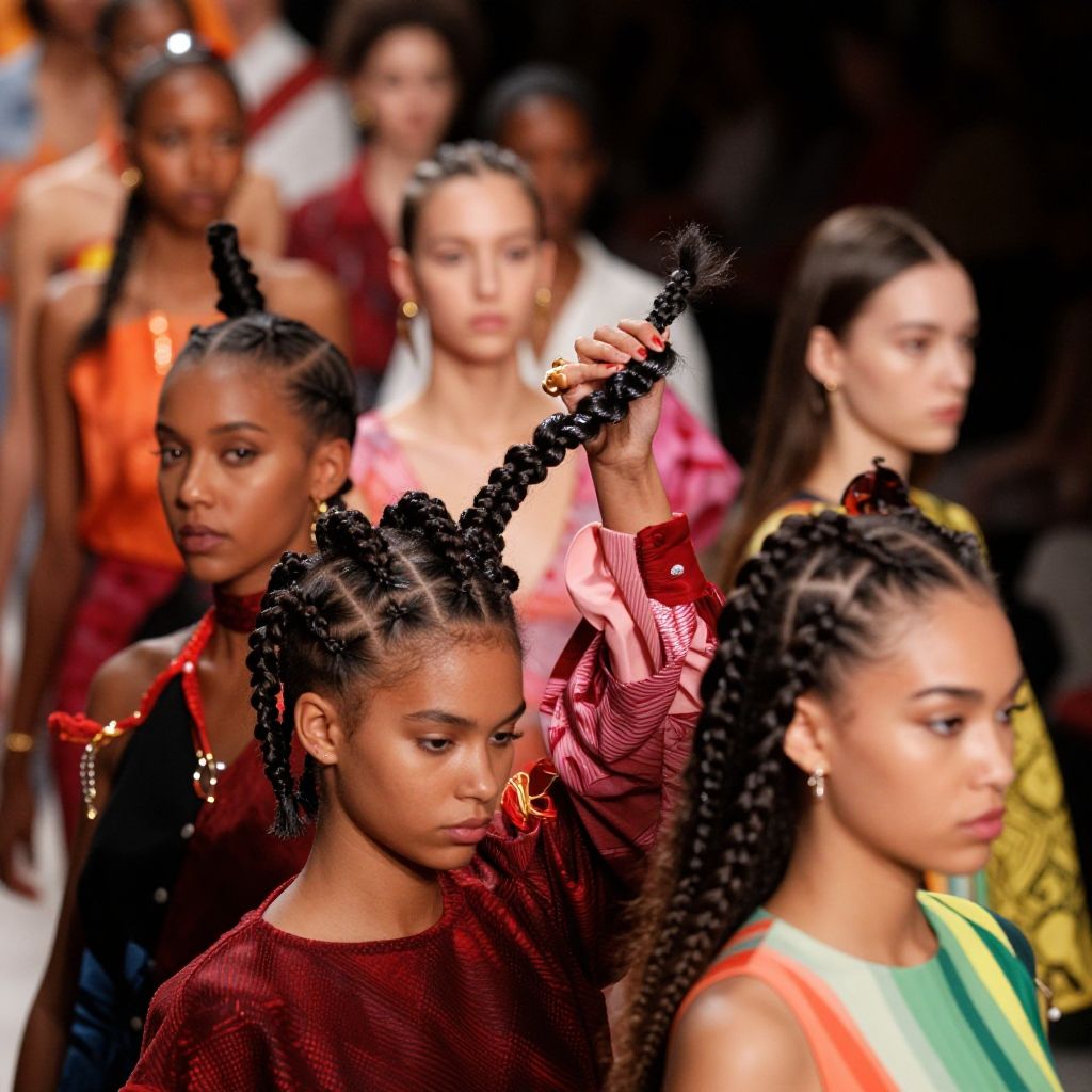 Iverson braids for females styled in a fashion runway environment, combining classic tight cornrows with modern twists, glossy hair finish reflecting spotlight, diverse models highlighting individuality and strength, dynamic movement captured with vivid colors.