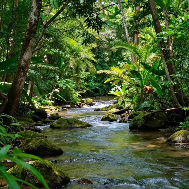 Photograph of a lush, tropical forest stream. Bright green ferns and palm leaves dominate the dense foliage, with sunlight filtering through the canopy. A clear, gently flowing stream meanders through the center, surrounded by moss-covered rocks. Tall, slender trees with textured bark rise on either side. The water sparkles as it cascades over small rocks, creating a serene and vibrant natural scene. The rich greenery contrasts with the darker, shadowed areas, creating depth and a sense of peaceful seclusion.