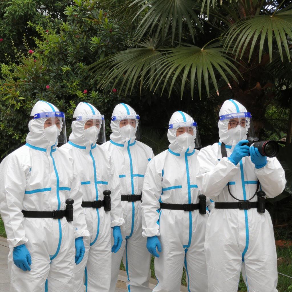 Photograph of two people in a sunlit outdoor setting, wearing white protective suits and clear face shields. One person in a silver full-body hazmat suit stands with their back to the camera, while the other, with light skin and brown hair, faces forward. They are surrounded by tall, dry grass.
