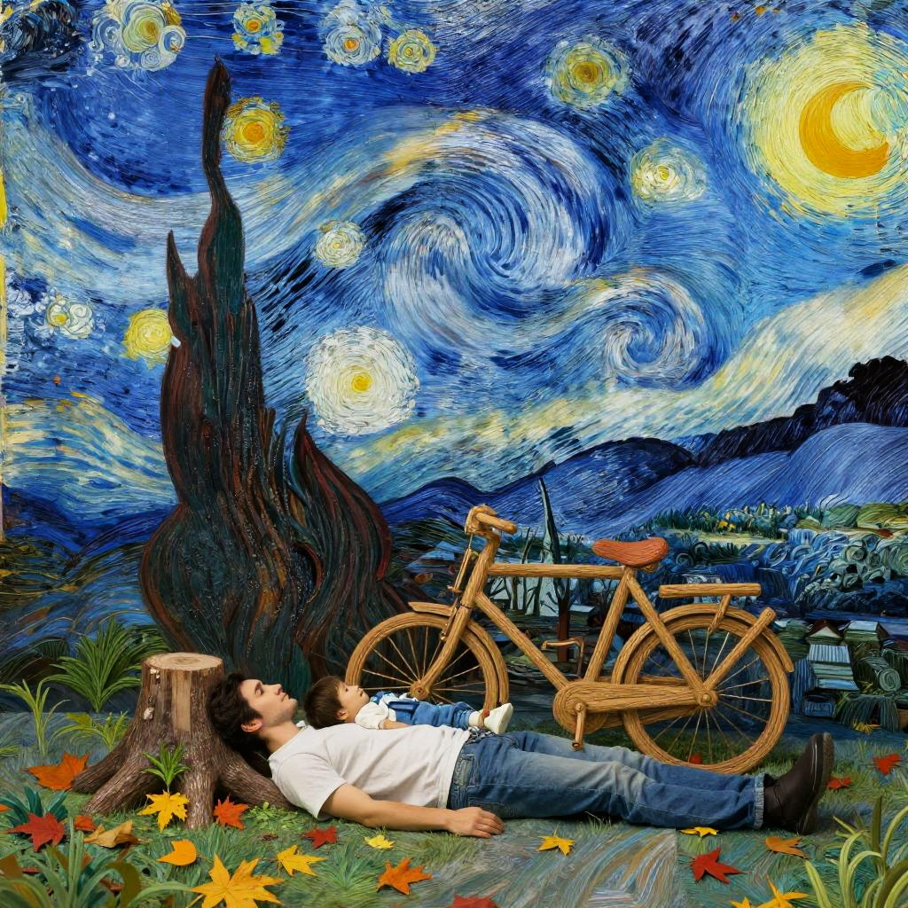 Man with toddler resting lying in bed, whimsical landscape with vibrant jewel tone hues, energetic swirling skies reflecting Van Gogh's technique, cartoonish elements, green old-fashioned bicycle leaning against thick tree trunk, digital illustration inspired by Van Gogh