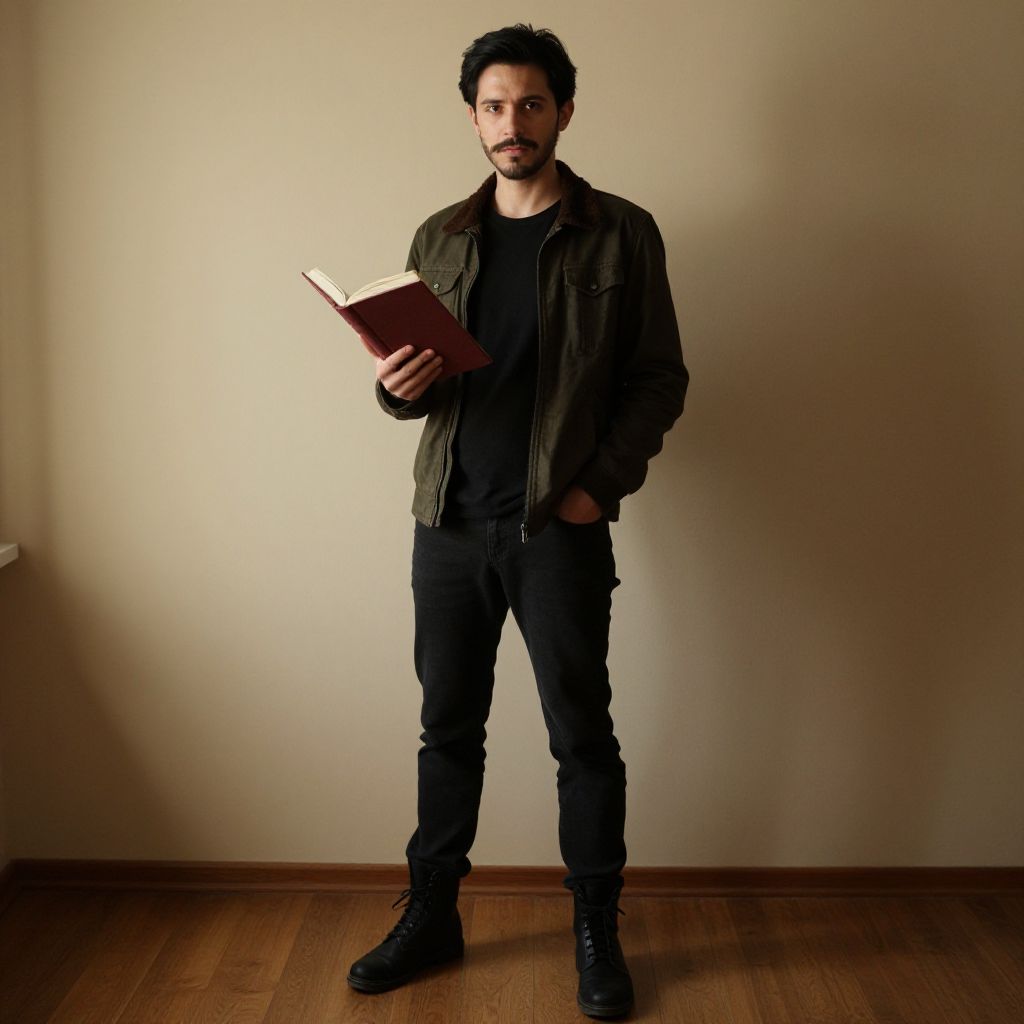 "midnight suns costume, 1boy, male focus, solo, facial hair, book, standing, holding, black hair, beard, full body, looking at viewer, holding book, jacket, mustache, indoors, boots Realistic photo of casual sexy person with pretty face"