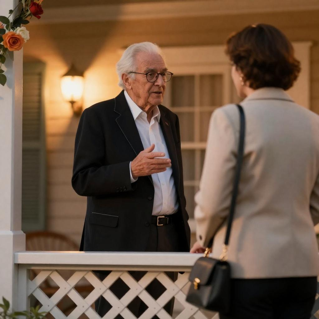 Photograph of an elderly man with white hair and glasses, wearing a black suit with white trim, gesturing with his right hand. He faces a woman with short brown hair, wearing a beige blazer and black handbag, standing on a porch with a lattice railing. Warm, orange-lit background with floral decorations.