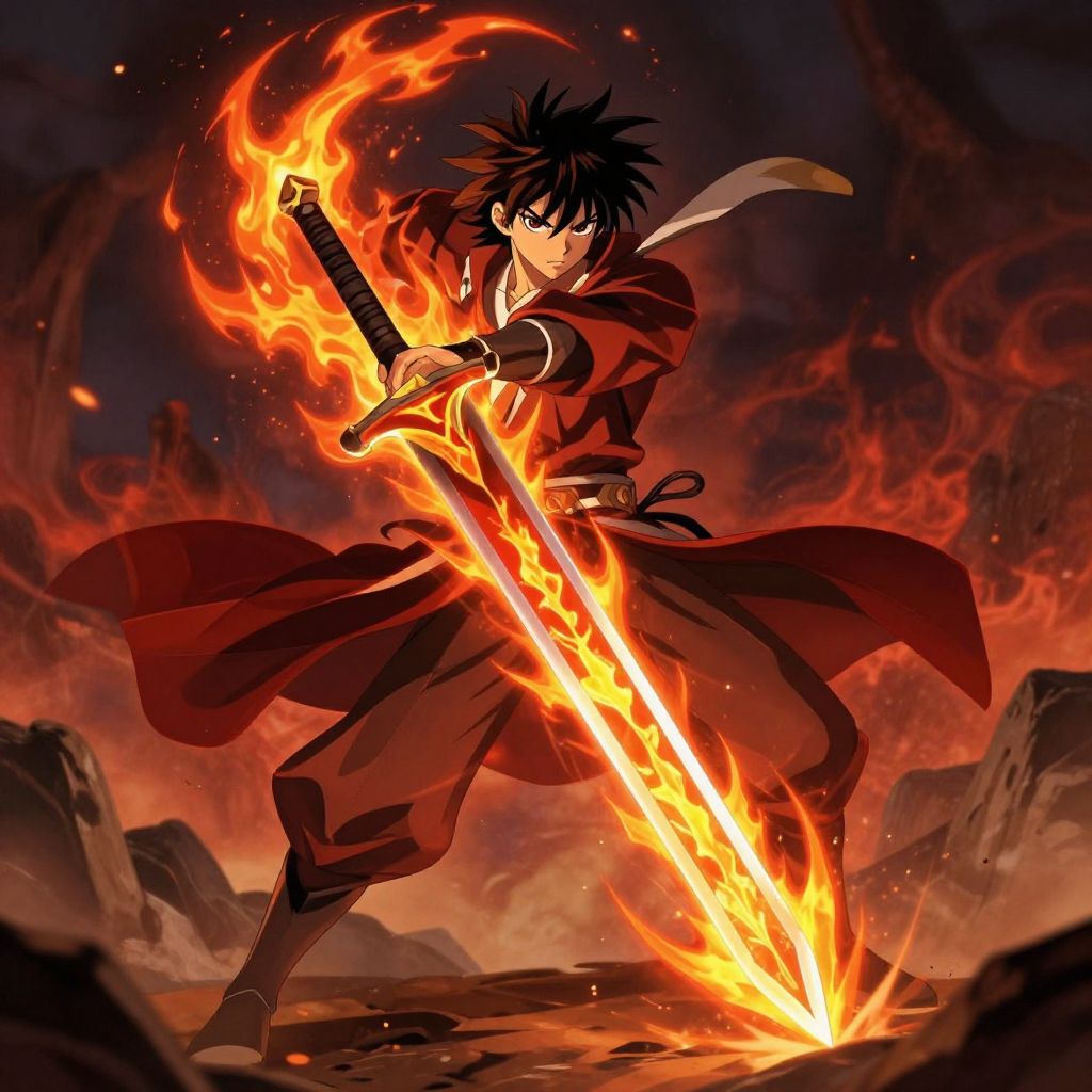 Fiery Anime Swordsman Battle Scene