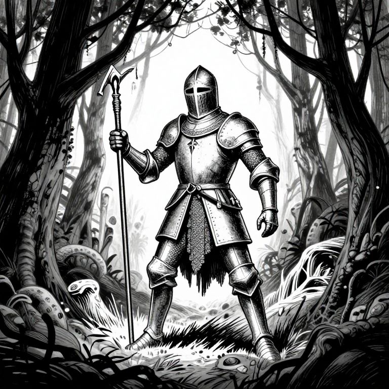Babylonian Art Black and white line drawing of a knight emerging from a haunted forest. Spooky. Gloomy. Grimdark. In the style of John Blanche.,