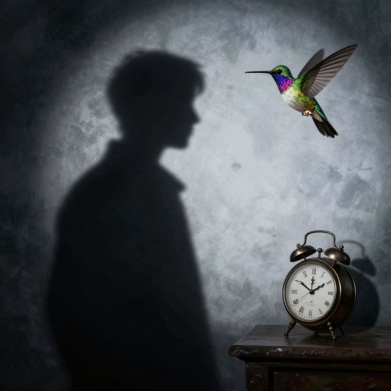 Photograph of a shadowy profile of a person with short hair facing left, silhouetted against a textured, gray-blue background. A vibrant, multicolored hummingbird with green, purple, and iridescent blue feathers hovers mid-air to the right. Below the hummingbird, an old-fashioned black and silver alarm clock with white numbers and hands rests on a dark wooden table. The clock's shadow falls to the right. The contrast between the bright hummingbird and dark silhouette creates a striking, dreamlike effect.