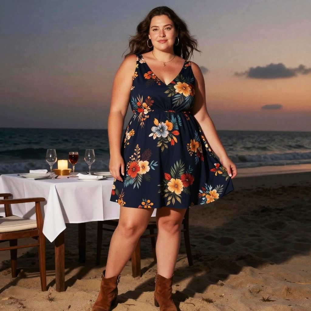 A lanky woman in a casual summer style, wearing a sleeveless navy A-line mini dress with a vibrant floral print and brown suede ankle boots, enjoys a Dusk Beach Dinner with a Sunset View, captured in a dark horse visual style. Sexy. Pretty face and beutiful eyes