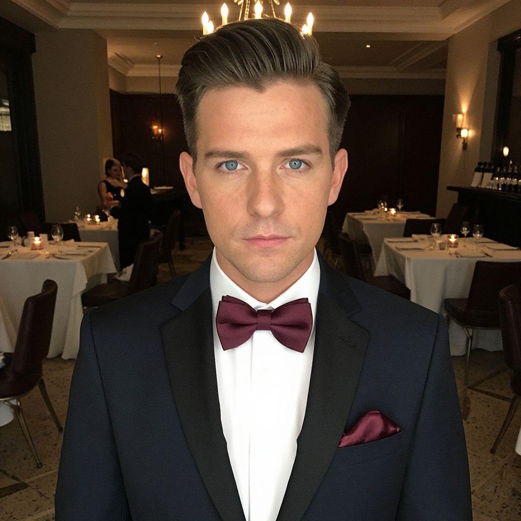 A formal portrait of a polished man in his 30s with sharp facial features and calm blue eyes, wearing a burgundy collar bow tie with a silk pocket square, attending a dinner event in a sophisticated restaurant with candlelit tables, elegant linoleum flooring, and dim ambient lighting.