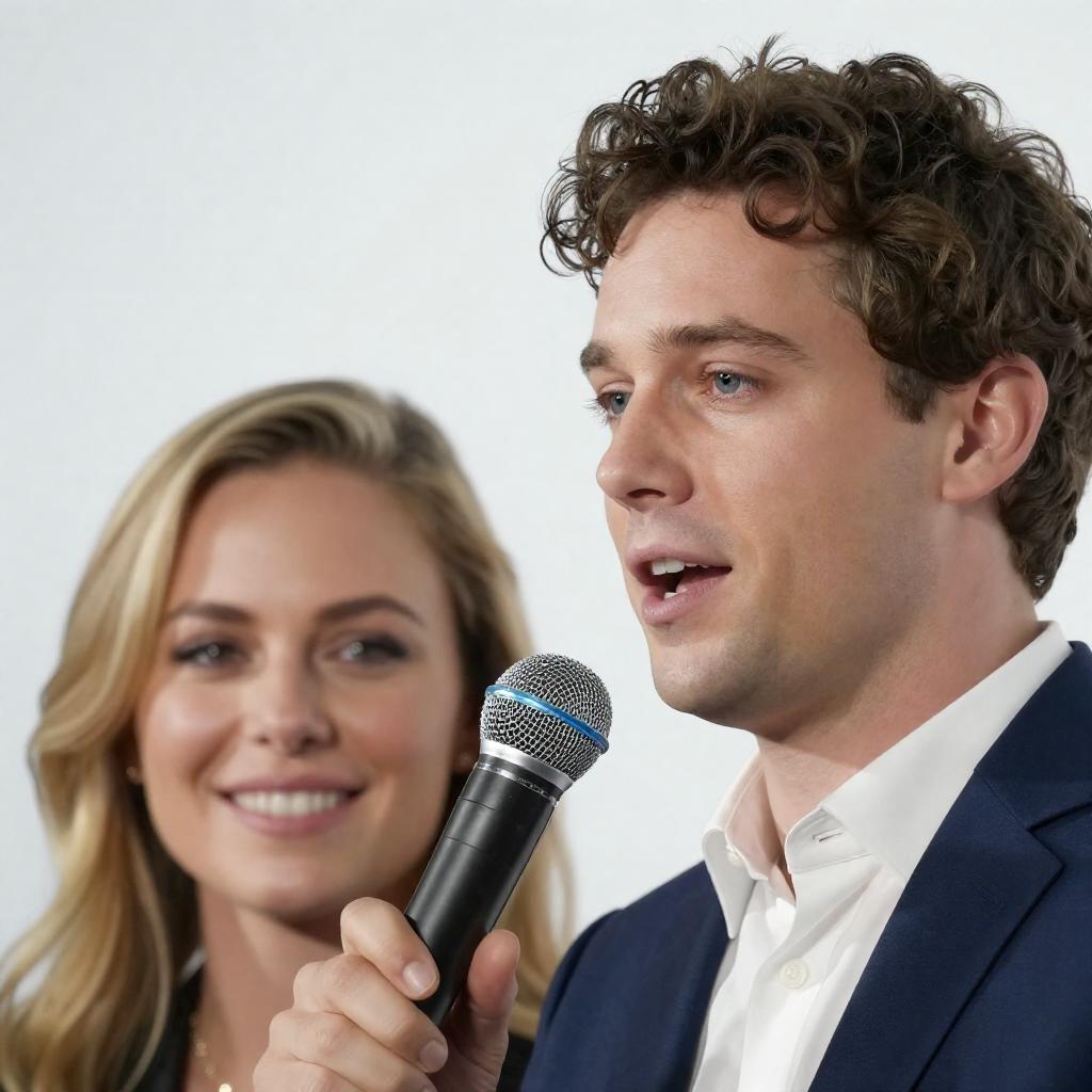 Photograph of a man and woman in close-up. Man with brown curly hair, blue suit, white shirt, open mouth, silver microphone. Woman with blonde hair, smiling, eyes slightly closed. Bright background. Both looking at microphone.