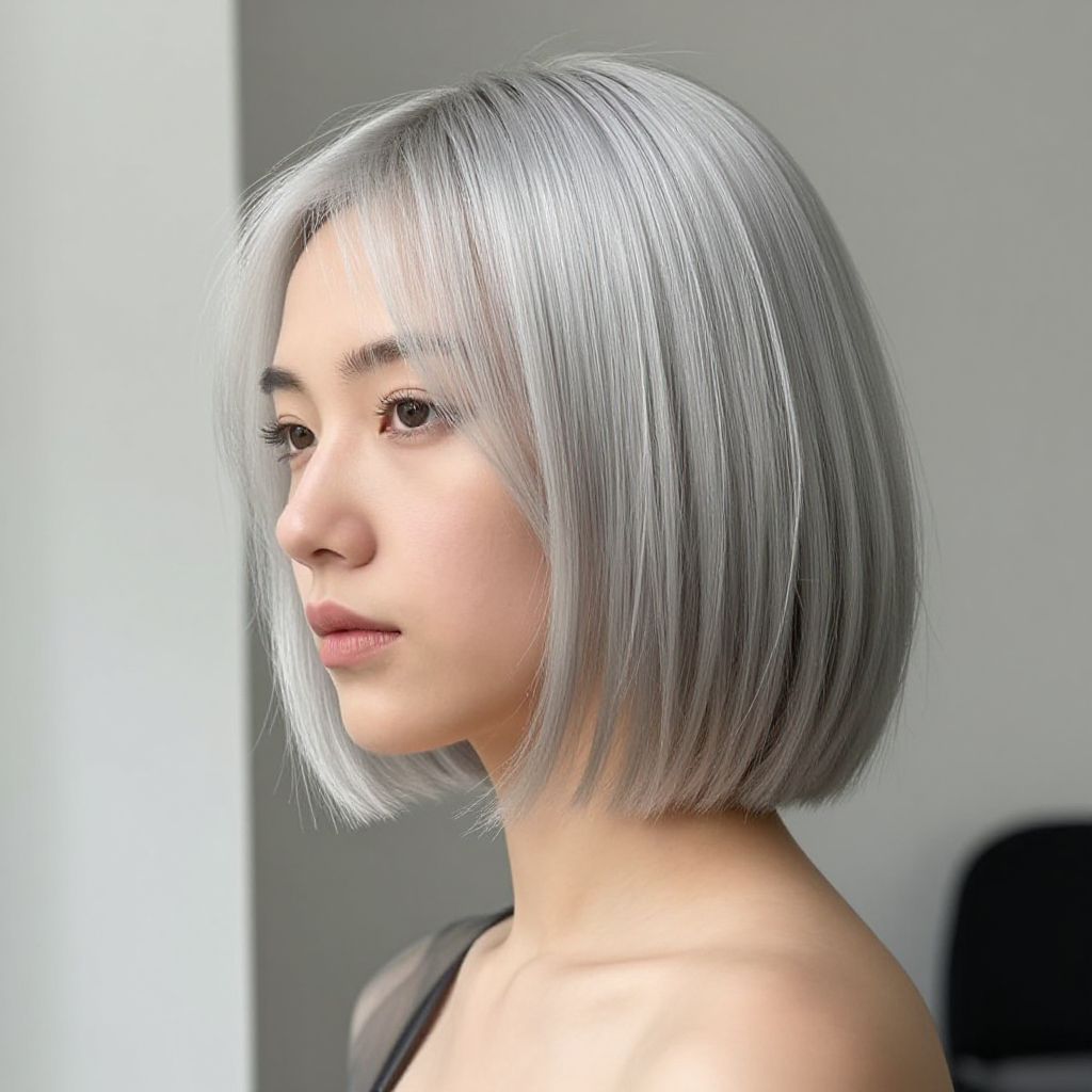 Elegant silver bob hairstyle on a female model, minimalist studio setting, soft natural light, sharp focus, modern beauty, subtle makeup