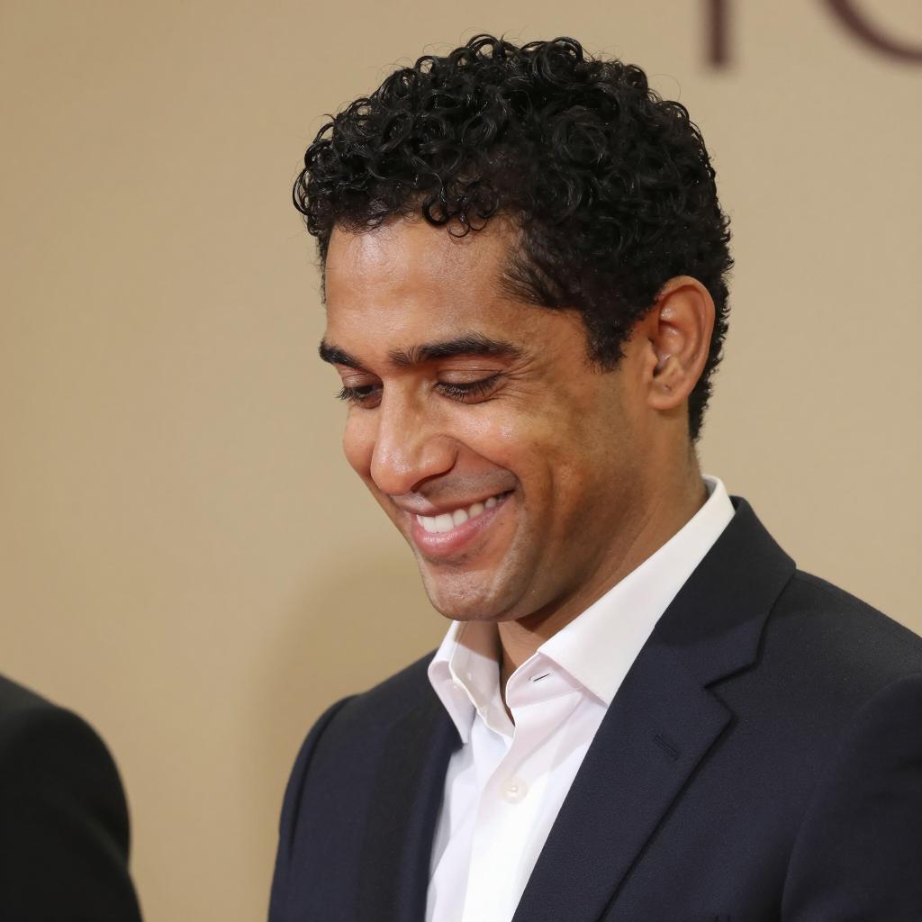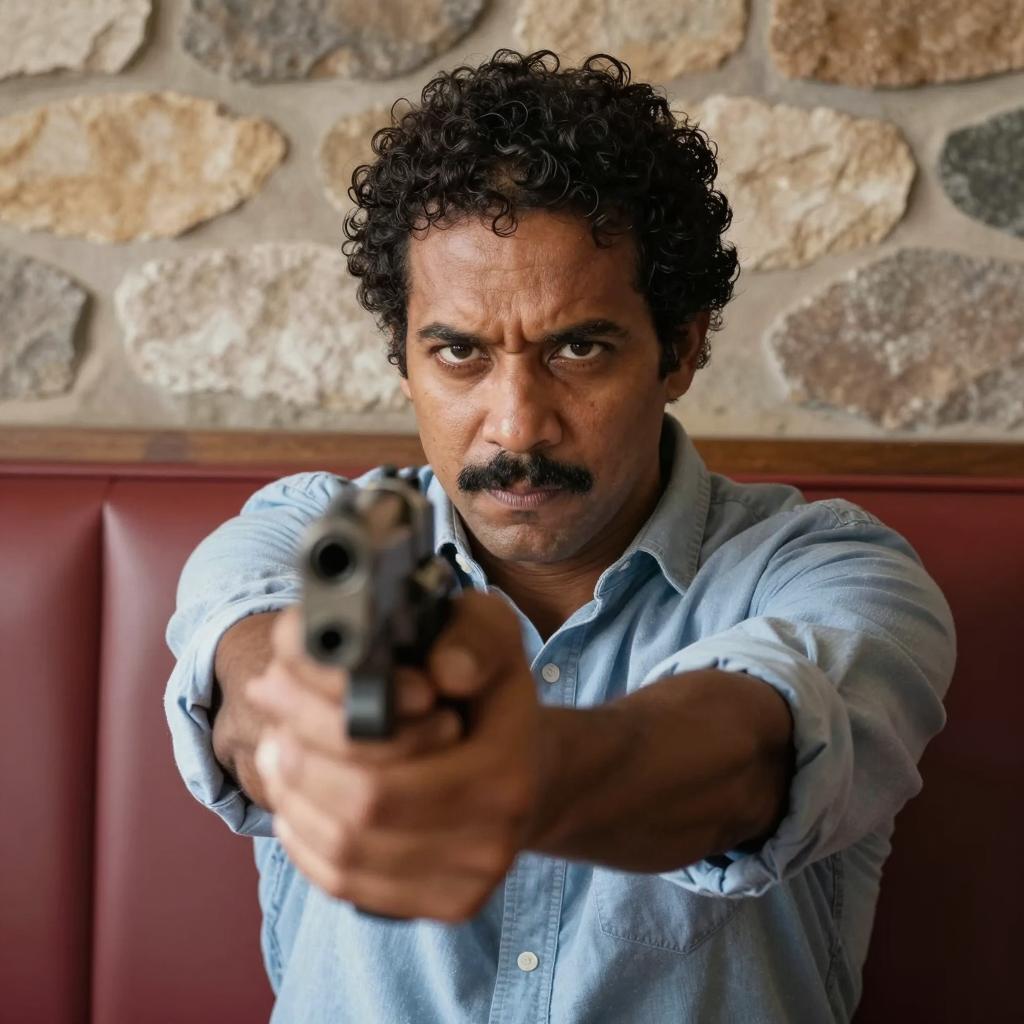 Photograph of a man with medium skin tone and dark, curly hair, wearing a light gray, plaid shirt. He holds a cup with a patterned sleeve in his right hand and gestures with his left hand. Background has a blurred, metallic structure. Intense, focused expression. Upper body only.