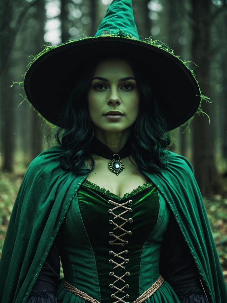 Woman in Green Witch Costume, cinematic realism, dark magical portrait