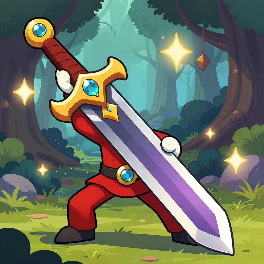 Sword 2d cartoon style, exaggerated fantasy blade with oversized hilt and jewel inlay, vibrant color palette including reds and purples, comic book shading, dynamic pose as if mid-swing, background of enchanted forest with magical sparks