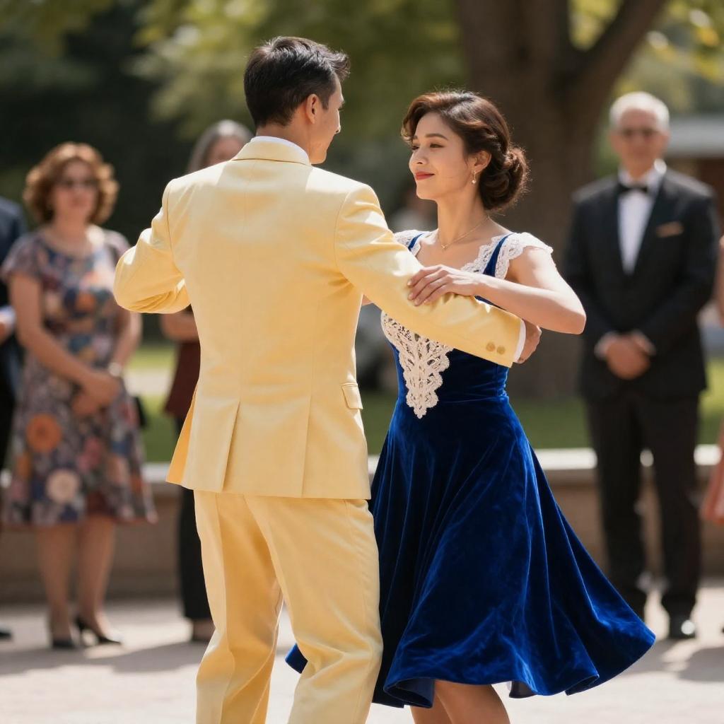 Photograph of a couple dancing on a tiled dock at sunset. The man in a black t-shirt and jeans holds the woman's hand. She wears a sleeveless, patterned dress and white shoes. Both have smiling expressions. The woman's dress flutters with her movement. The background shows a calm lake and distant trees. The man and woman face each other, extending their arms. Sunlight casts a warm glow over the scene.