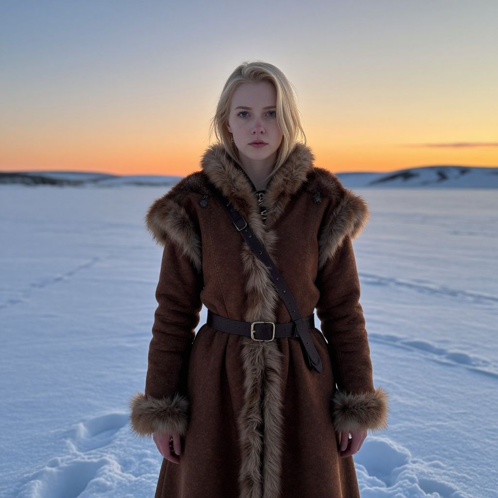 Photograph of a young blonde woman standing in a snowy, desolate landscape at sunset. She has fair skin, blue eyes, and a serious expression. She's wearing a brown, fur-trimmed, medieval-style coat with a high collar and a belt. The snow around her is smooth, with visible footprints. The sky above is a gradient from orange to blue. The background includes distant, snow-covered hills.