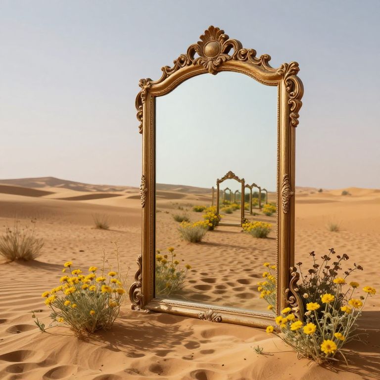 In a golden desert, an ornate mirror stands amidst wildflowers, its reflection revealing an endless path of identical mirrors receding into the horizon, defying the boundaries of space and perception.