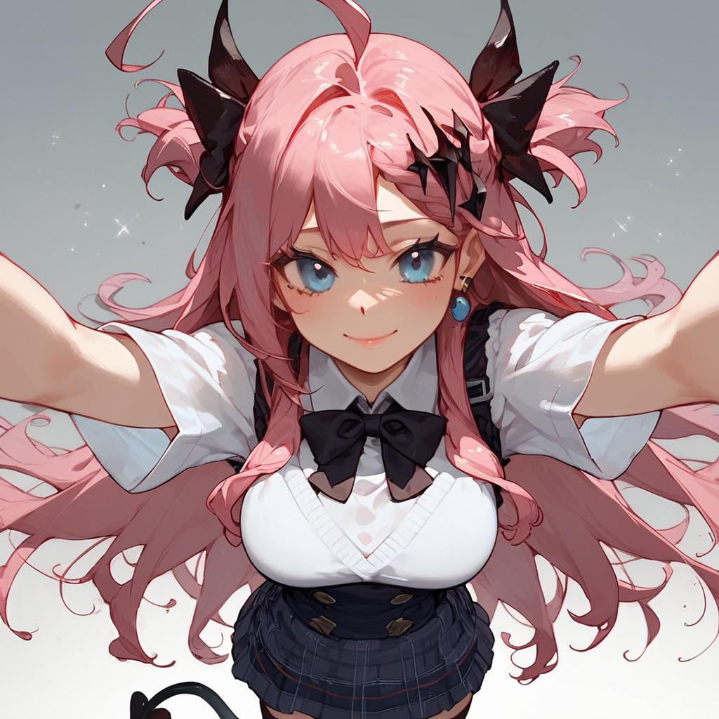 Score_9, score_8_up, score_7_up, score_6_up, score_5_up, score_4_up, source_anime, screenshots, 1girl, lala satalin deviluke, long hair, pink hair, ahoge, green eyes, hair ornament, medium breasts, bow, sweater vest, white shirt, collared shirt, short sleeves, plaid skirt, black thighhighs, tail, close-up, smile, spread arms, from above, upper body