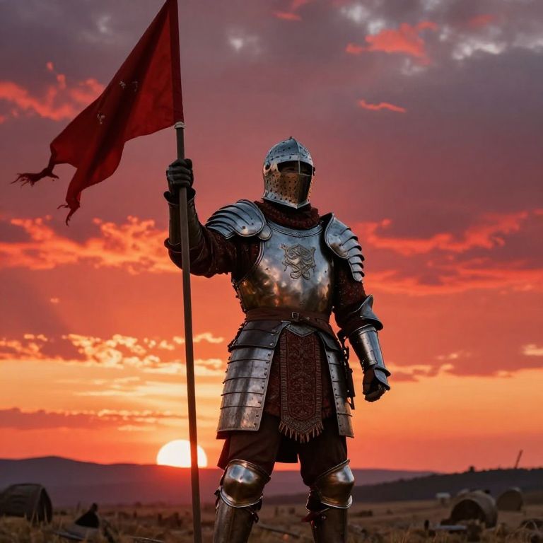 Medieval knight in shiny silver armor with red flag, standing at sunset, holding pole, against vibrant orange and red sky. Photographic image.