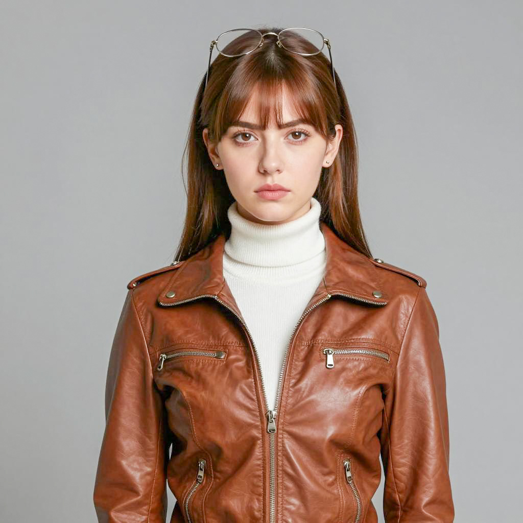 Portrait of a young woman with long, straight, light brown hair and blue eyes, fair skin and light makeup. She is wearing a black leather jacket over a black shirt, carrying a small brown and silver crossbody bag on her right shoulder. The background is a plain beige wall.