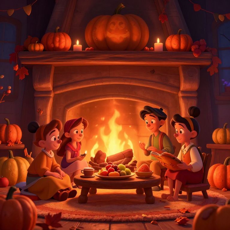 Thanksgiving image created by Disney AI, illustrating a cozy fireplace scene with Disney-styled characters sharing stories and food, surrounded by autumnal decorations, glowing candles, and whimsical fantasy elements blending traditional harvest themes with animation magic.