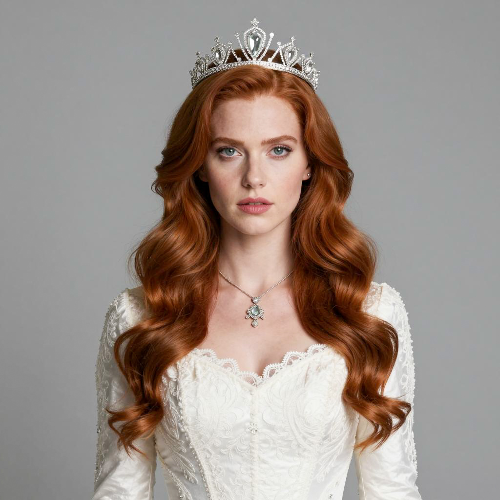 A striking woman with long, flowing red hair wears an intricate silver crown adorned with blue gems and an ornate matching necklace. She is dressed in a black garment, showcasing a detailed black and gray floral tattoo on her upper arm, set against a dark, blurred background that enhances the regal and modern gothic style of the portrait.