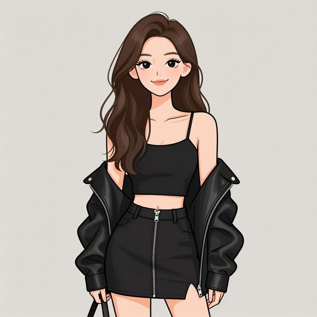 Digital anime-style drawing of a smiling woman with long brown hair, red beret, black coat, white t-shirt, and blue denim skirt.