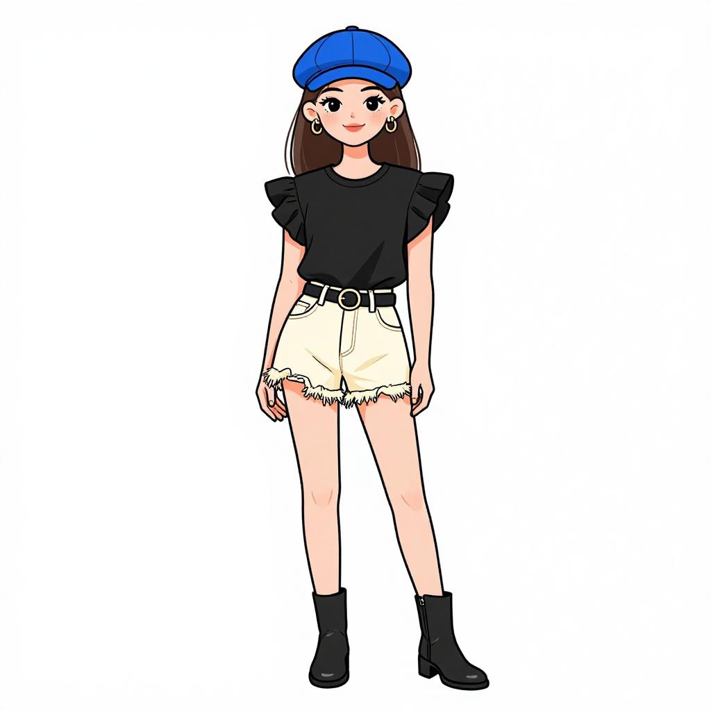 This is a digital illustration of a young woman with light skin and long brown hair, wearing a red beret, white t-shirt, blue high-waisted denim skirt with frayed edges, and a black trench coat. She has large black eyes, a small smile, and is wearing small hoop earrings. Her hands are in the pockets of her coat. The background is plain white, making her the focal point. The illustration style is modern, with bold lines and vibrant colors, typical of contemporary digital art.