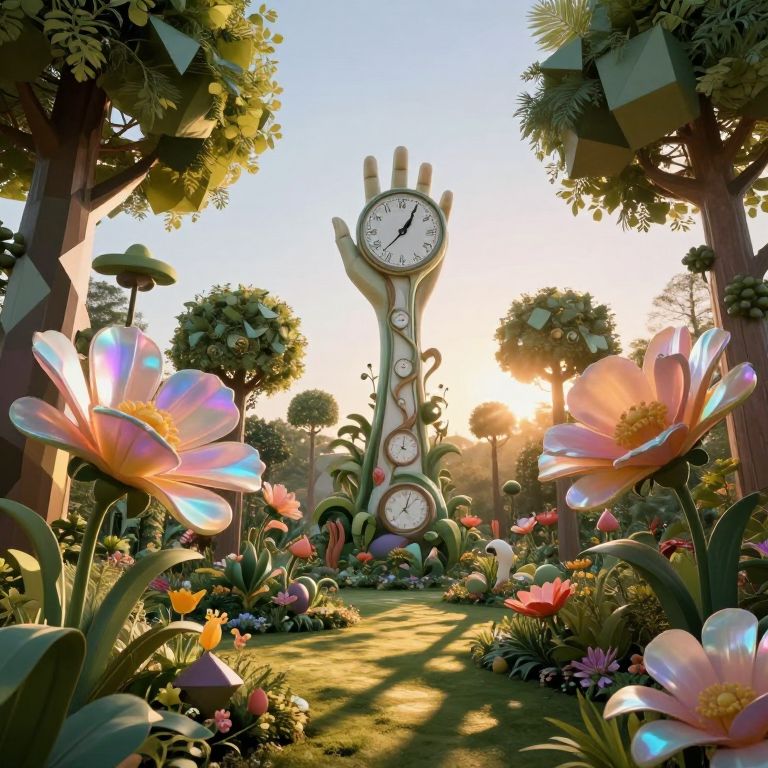 A surreal digital artwork portraying an enchanting garden with oversized flowers featuring iridescent petals, blooming amidst geometrically distorted trees in the style reminiscent of melting clocks. The scene is viewed from a low-angle perspective, offering an otherworldly sense of scale as if standing within a vast landscape. A tower resides at the heart of this botanical wonderland, its hands frozen in time while the surrounding flora and fauna bend and flow around it, creating a captivating fusion of nature and mechanical elements. The warm light of the setting sun casts long, dappled shadows across the scene, evoking tranquility and curiosity.