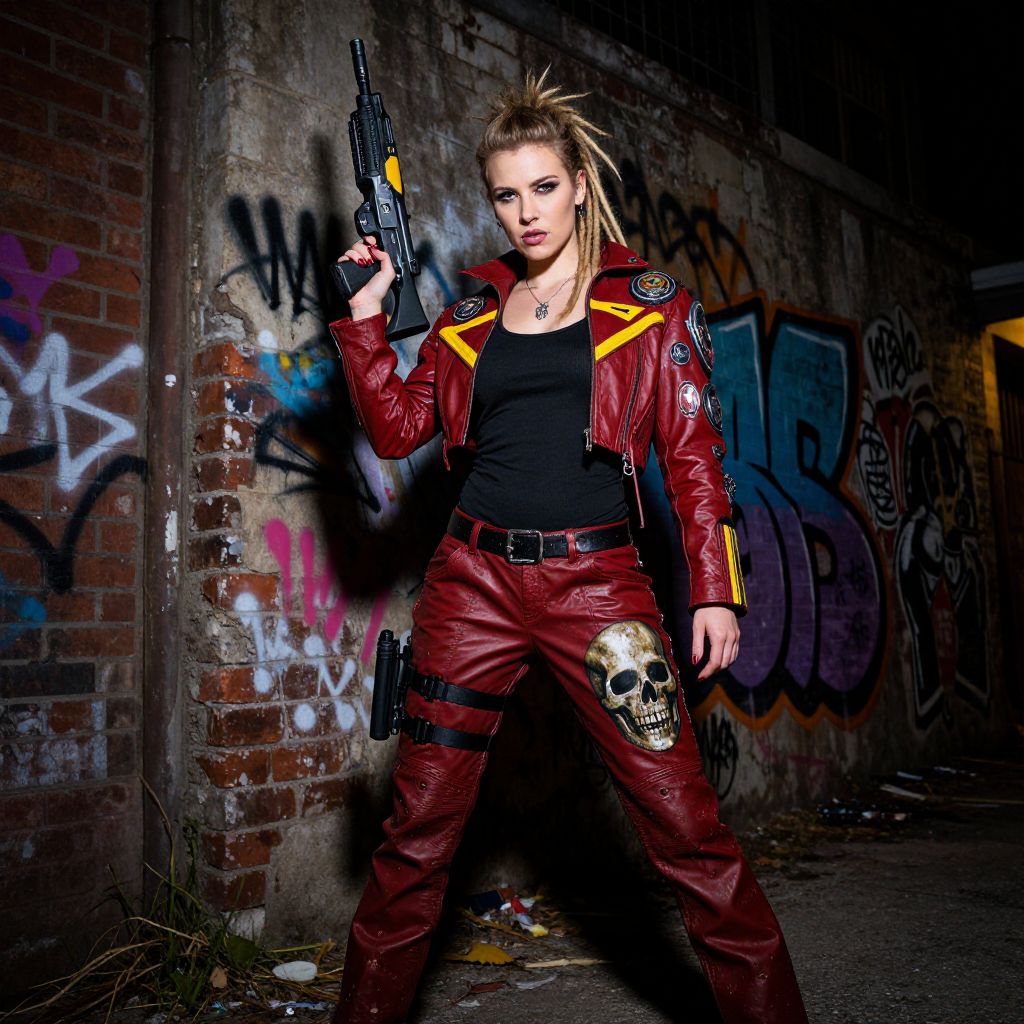 Photograph of a tough, blonde woman with a high ponytail, standing in a dimly lit, graffiti-covered urban alleyway. She wears a red, leather jacket with yellow stripes, a black tank top, and matching red leather pants featuring a skull design on the right leg. She holds a black handgun in her right hand, raised to shoulder level, and has a holstered gun on her left thigh. The background includes a brick wall with colorful graffiti, adding a gritty, edgy atmosphere. The lighting highlights her determined expression and the textures of her leather outfit.