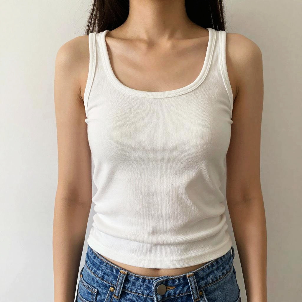 Close-up photo of a young Asian woman wearing a sleeveless white tank top and blue denim jeans. The image focuses on the upper torso and midsection against a plain light background, highlighting casual fashion.