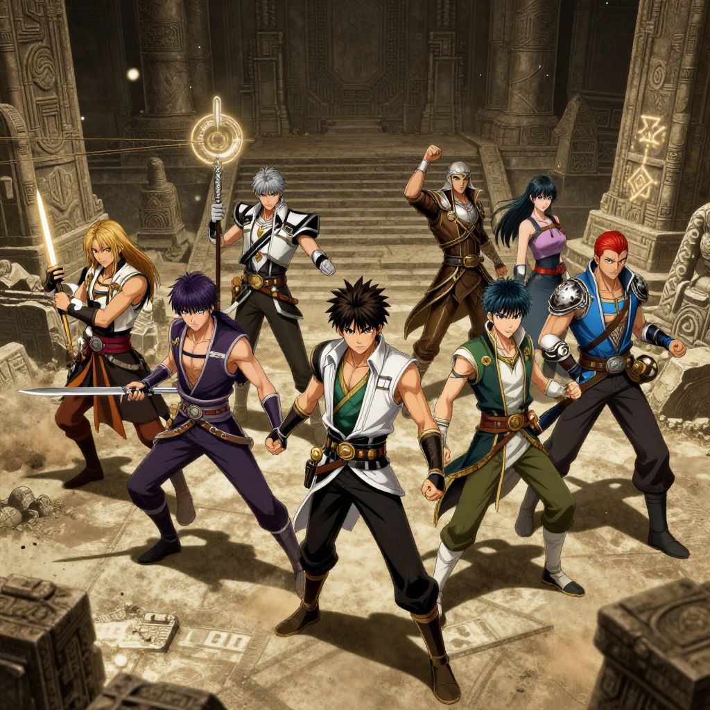 Digital artwork of seven anime-style warriors in a dimly-lit, ancient temple. The group is positioned in a dynamic, battle-ready stance. The central figure, with spiky blue hair and a white sleeveless shirt, holds a sword. Surrounding him are warriors with diverse hair colors (blonde, blue, red, purple) and outfits, including tunics, armor, and belts. They wield various weapons like swords and staffs. The background features stone pillars adorned with intricate carvings and ancient runes. The ground is dusty, and a large, glowing circular symbol is visible in the upper left. The lighting is dramatic, highlighting the characters' determined expressions and muscular builds.