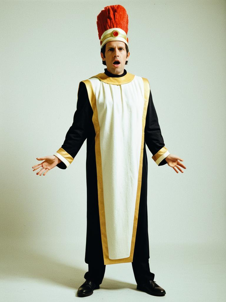 Full-body image of a man wearing a parody costume designed to resemble a Caesar dressing bottle. The costume features a black and white robe with gold trim and a tall red headdress. The man has an expressive facial expression and stands against a plain light background.