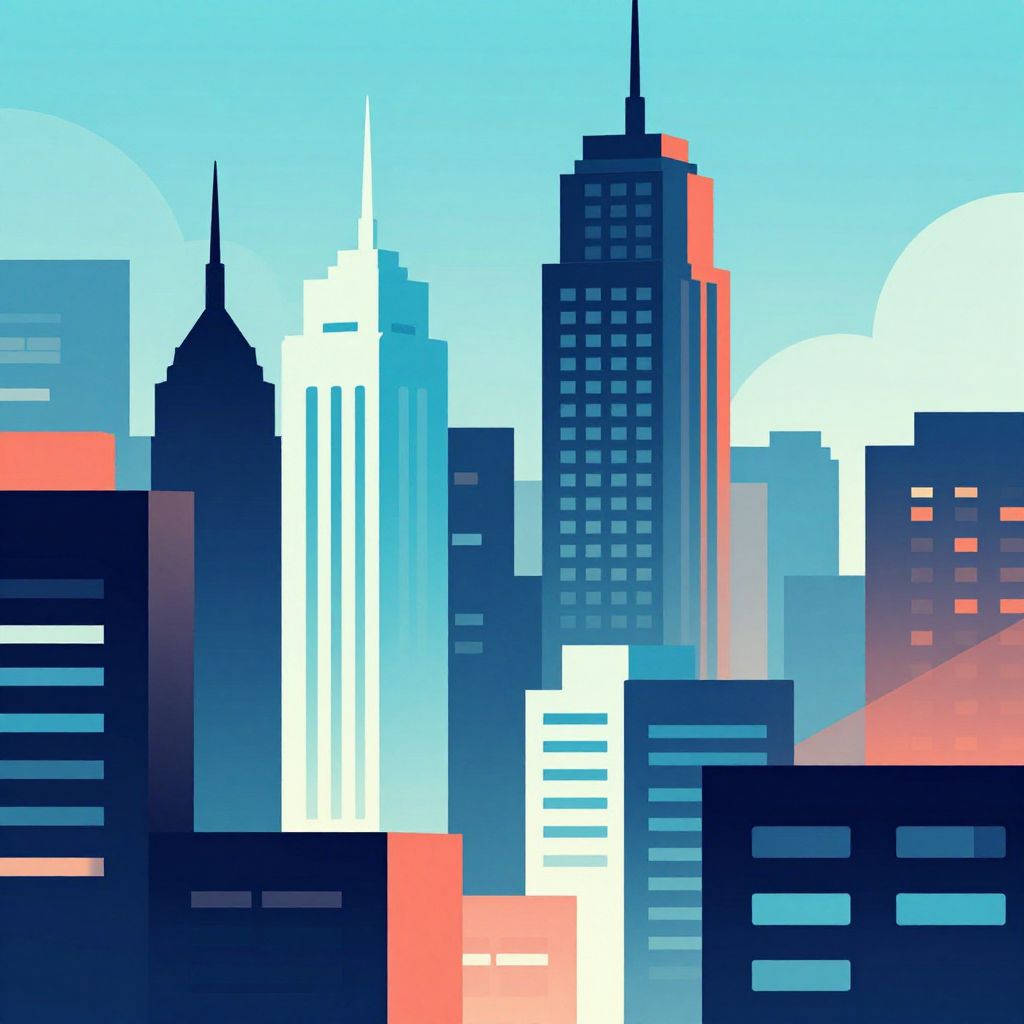 Digital illustration of a city skyline with stylized, geometric buildings in bold blue, white, and red hues against a bright blue sky.