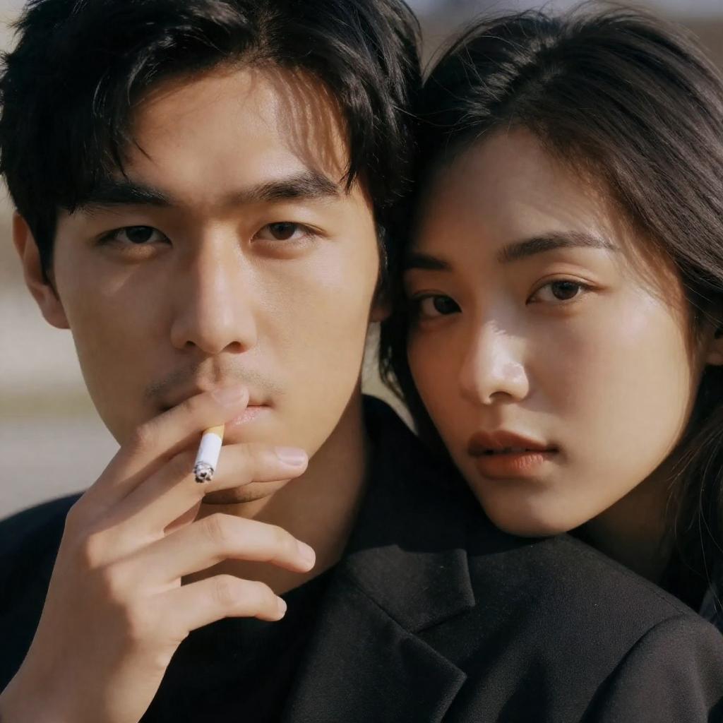 Photograph of an Asian couple with dark hair, close-up. The man, on the left, holds a cigarette to his mouth, looking intently at the camera. The woman, on the right, rests her head on his shoulder, partially obscured. Bright sunlight creates strong contrasts and shadows on their faces.