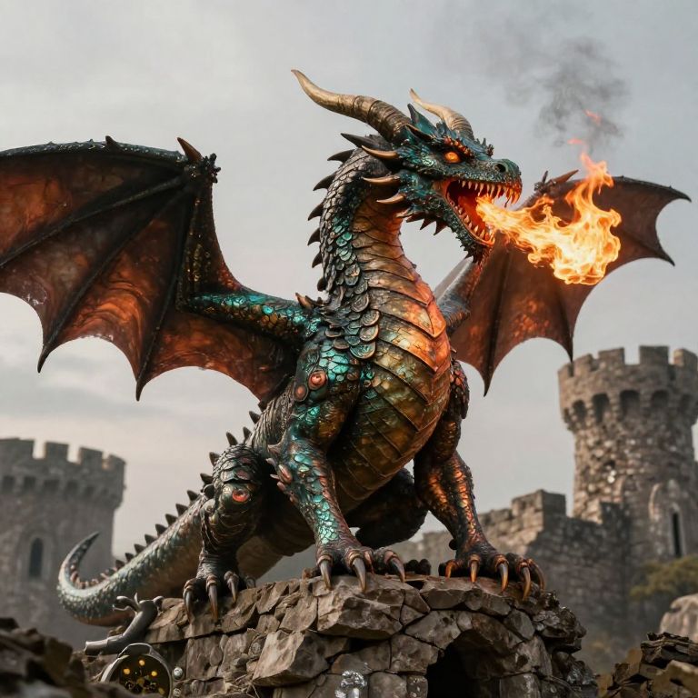 Realistic dragon full body perched on ancient castle ruins, aged bronze and copper scales reflecting fading sunlight, detailed horns and ridges along spine, muscular legs firmly planted on crumbled stone, glowing eyes, plume of fire curling from open jaws, mystical and heroic atmosphere.