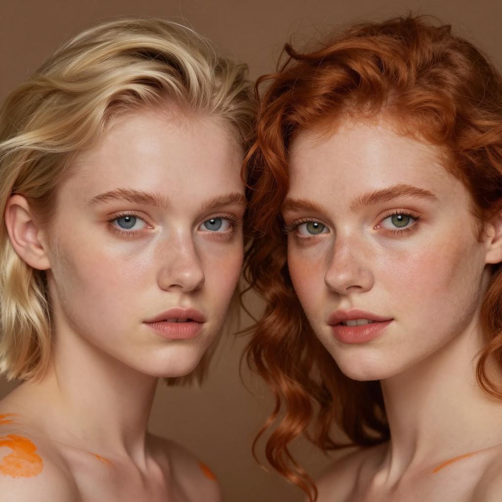 Two women in white, lace-trimmed dresses sitting outdoors. Left woman with short blonde hair, right hand on chin, right wrist with bracelet. Right woman with brown hair, holding basketball, pearl necklace. Background: chain-link fence, flowers. Sunlight.