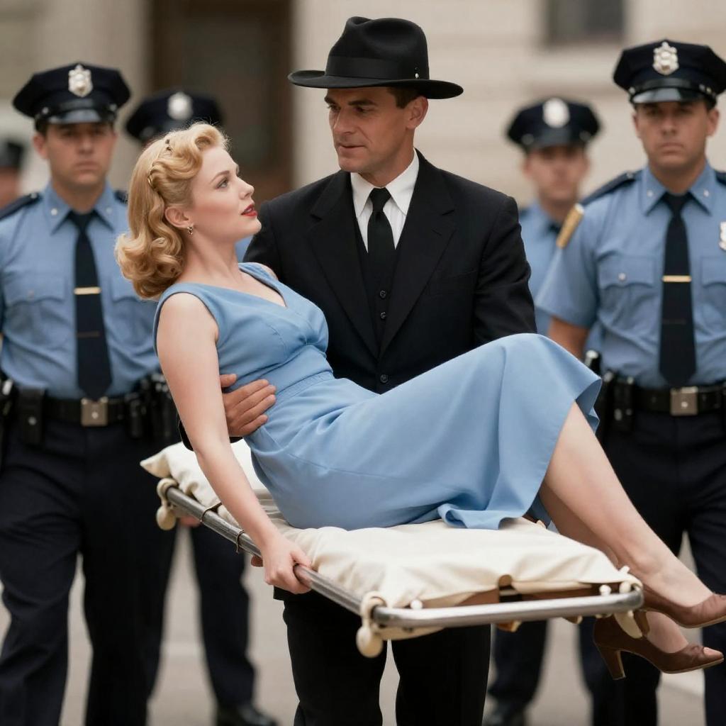 Vintage movie still of three people in an office. Blonde woman in blue blouse and brown skirt stands between man in black suit and man in police uniform holding papers. Desk with documents and phone. Man in suit gestures, woman looks surprised. Police officer has stern expression. Office background.