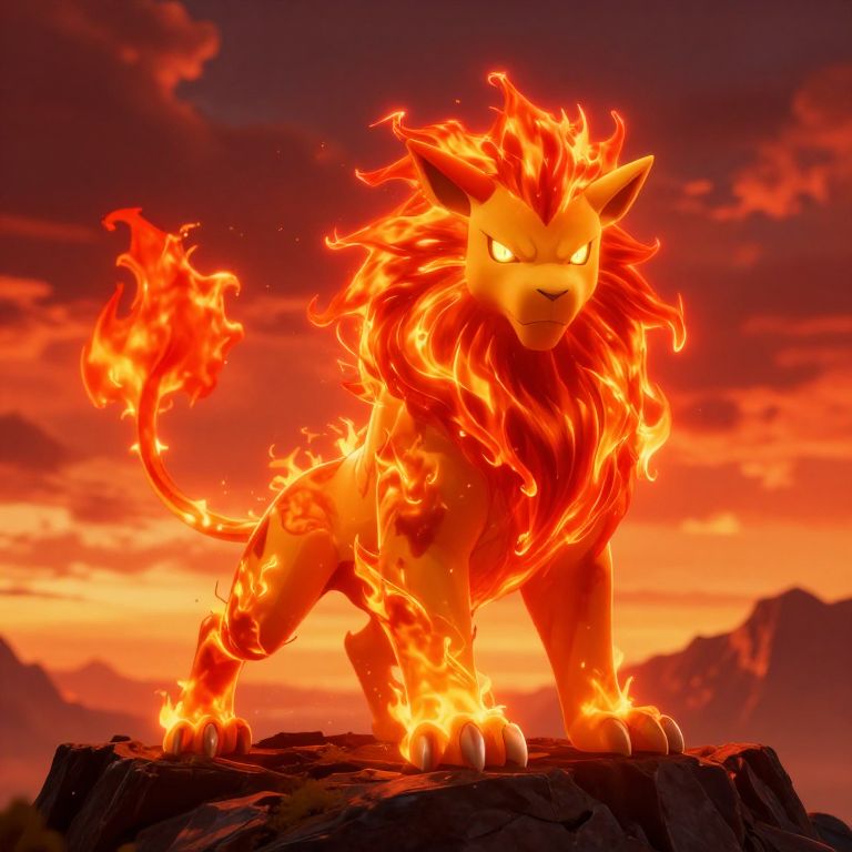 Pokemon fire lion blazing with bright orange and red flames, fierce eyes glowing, standing majestically on a rocky mountain top under a fiery sunset sky, dynamic action pose, detailed fur and flames, high fantasy style