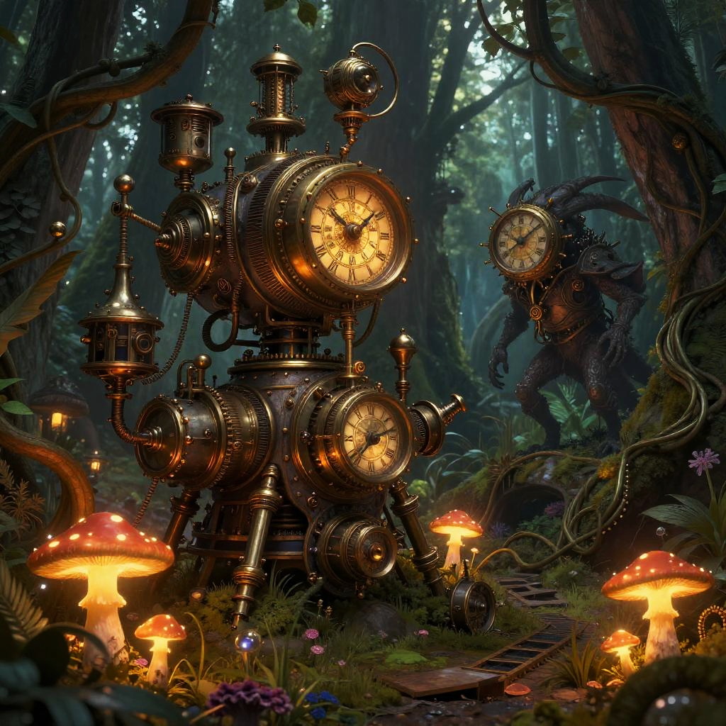 Steampunk fantasy art featuring an enchanted forest where nature intertwines with complex steam-powered devices, glowing mushrooms and metallic vines blend harmoniously, with a mysterious clockwork creature lurking in the shadows, rich color palette with magical ambiance.
