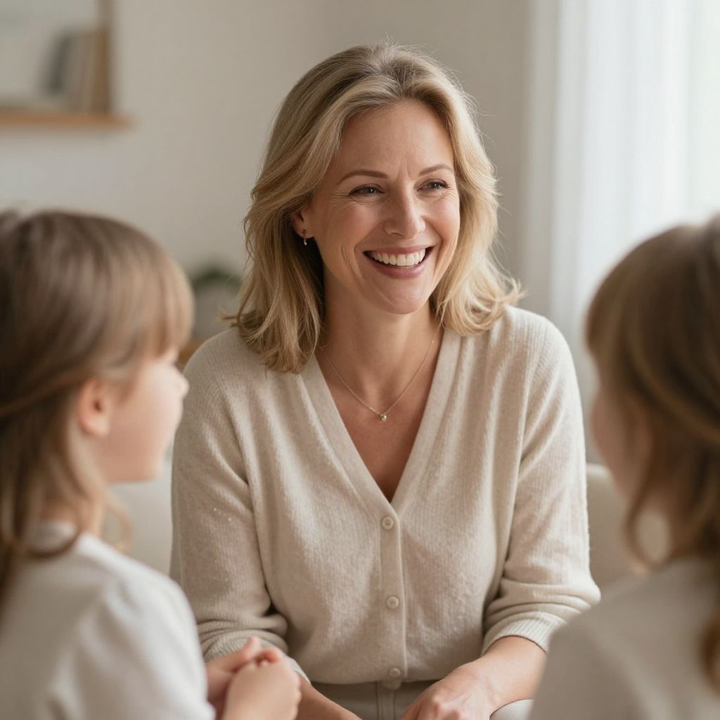 Radiant serenity and timeless joy intertwine as a mature woman shares laughter and warmth with loved ones, her gentle smile echoing the soft hum of connection and the enduring comfort of shared moments.
