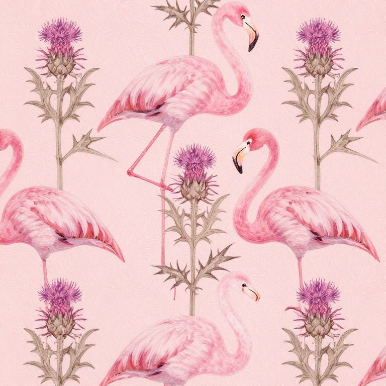 This is a digital illustration featuring a repeating pattern of pink flamingos with long necks and slender legs, standing beside tall, purple thistles with spiky petals and greenish stems. The flamingos are depicted in various poses: some standing gracefully, others bending down to peck at the thistles. The background is a clean, bright white, making the pink and purple colors of the flamingos and thistles pop. The illustration has a delicate, watercolor-like texture with soft, flowing lines. The repeating pattern creates a harmonious and elegant design.