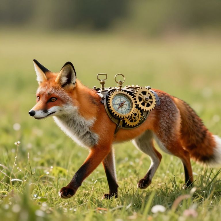 In a whimsical steampunk-inspired digital artwork, a clockwork fox adorned with intricate brass gears and a compass-like device on its back strides through a sunlit meadow, its fur blending seamlessly with the pastoral setting as it embodies the surreal fusion of nature and mechanical wonder.
