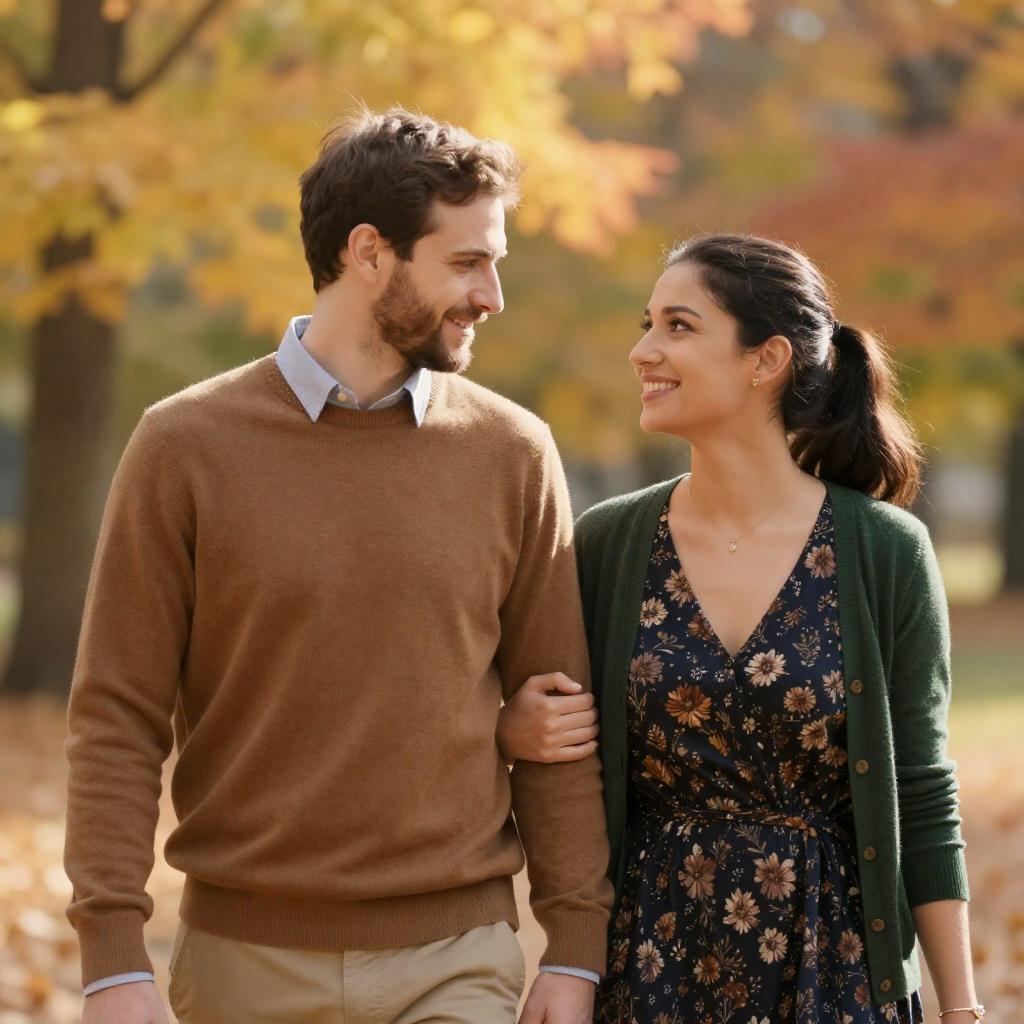 Photograph of a social outdoor event. Central woman in green dress holds yellow parasol, smiling. Dark-haired woman in red floral top and black pants stands beside her. Bearded man in blue suit and black shirt on left. Pink cherry blossom tree in background. Multiple people, casual attire, standing and conversing. Sunlit, colorful setting.
