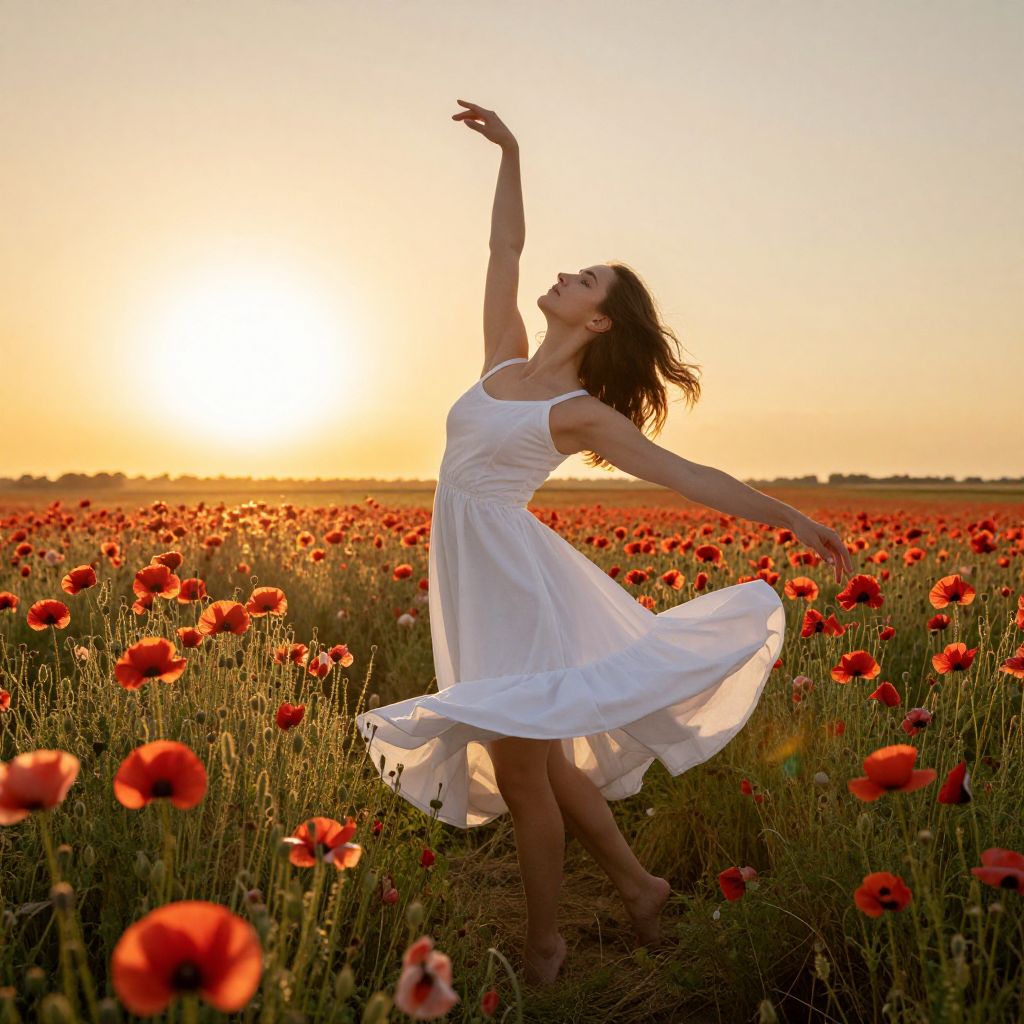 Photograph of a woman in a flowing white dress dancing in a sunlit poppy field, her arms raised gracefully against a golden sunset.