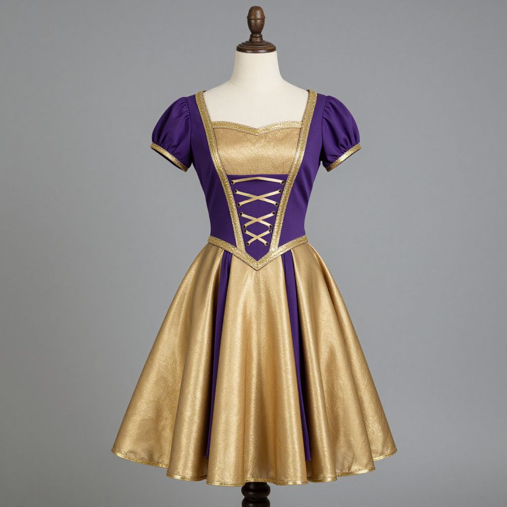 Photograph of a vintage-style dress displayed on a white mannequin against a plain gray background. The dress features a deep purple bodice with short puffed sleeves and a gold square neckline. The bodice is adorned with white lace-up detailing at the front. The skirt is a golden, shimmering fabric that flares out in a circular shape. The purple and gold colors contrast sharply, and the dress has a medieval-inspired design with a fitted waist. The mannequin's head is black and simple, focusing attention on the elaborate dress.