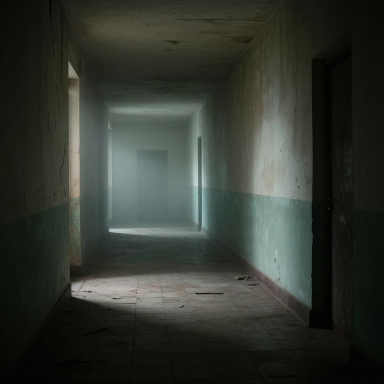 Abandoned liminal space, eerie empty corridor with peeling paint and flickering lights, surreal atmosphere blending between reality and dream, soft shadows casting unsettling shapes, subtle fog rolling across cracked tiled floor, cinematic mood